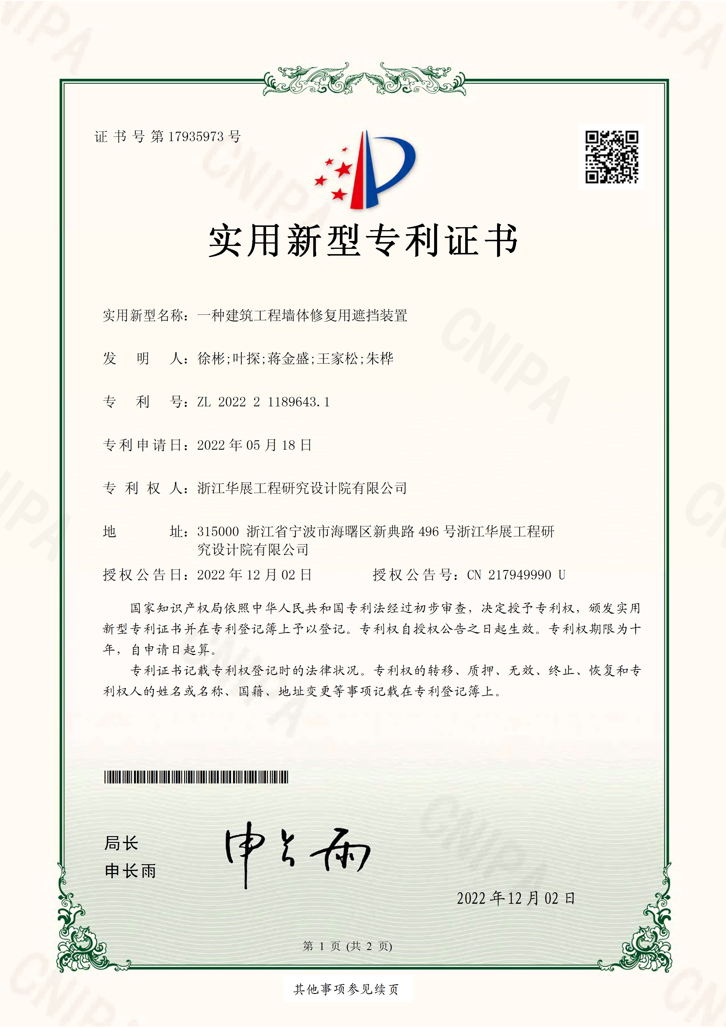 實(shí)用新型專利證書 一種建筑工程墻體修復(fù)用遮擋裝置